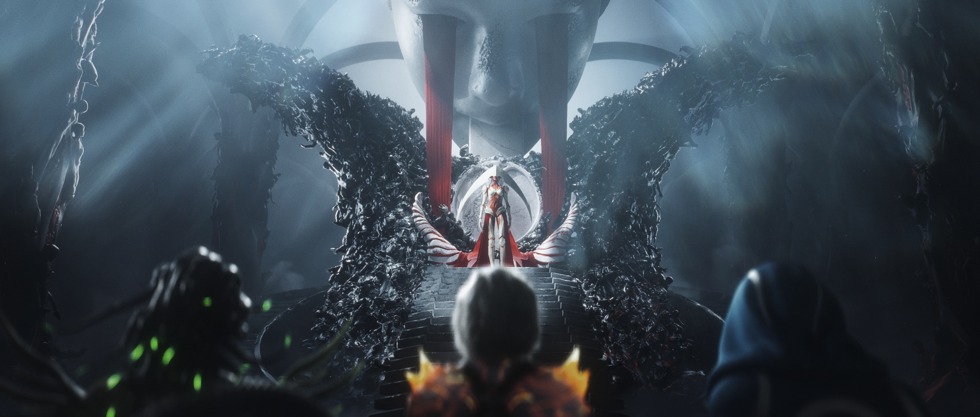 The trailer illustrates the resistance of the heroes (planewalker) to the phyrexian invasion through a large freeze frame battle composition where dazzling white porcelain statues face hordes of creatures covered in phyrexian oil, source of extraterrestrial life, gradually swallowing up any hope of victory. This graphic confrontation ends with the imposing throne of Helesh Norn composed of thousands of statues of soldiers who perished in front of it.