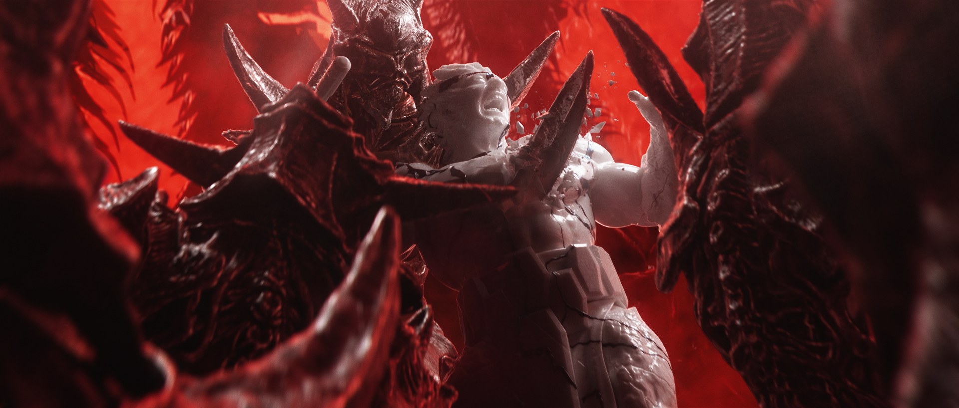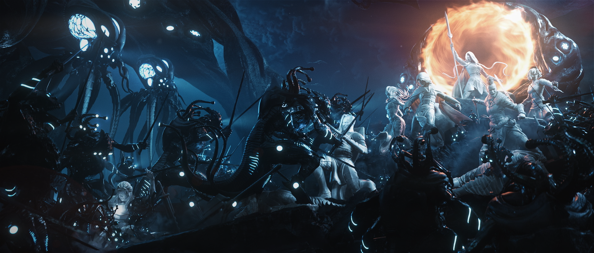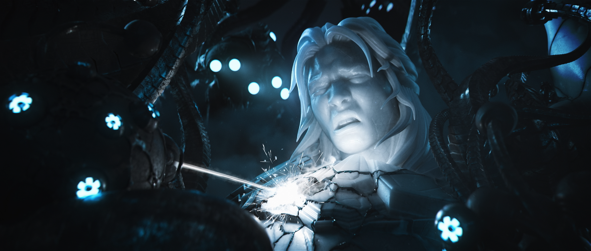 The trailer illustrates the resistance of the heroes (planewalker) to the phyrexian invasion through a large freeze frame battle composition where dazzling white porcelain statues face hordes of creatures covered in phyrexian oil, source of extraterrestrial life, gradually swallowing up any hope of victory. This graphic confrontation ends with the imposing throne of Helesh Norn composed of thousands of statues of soldiers who perished in front of it.