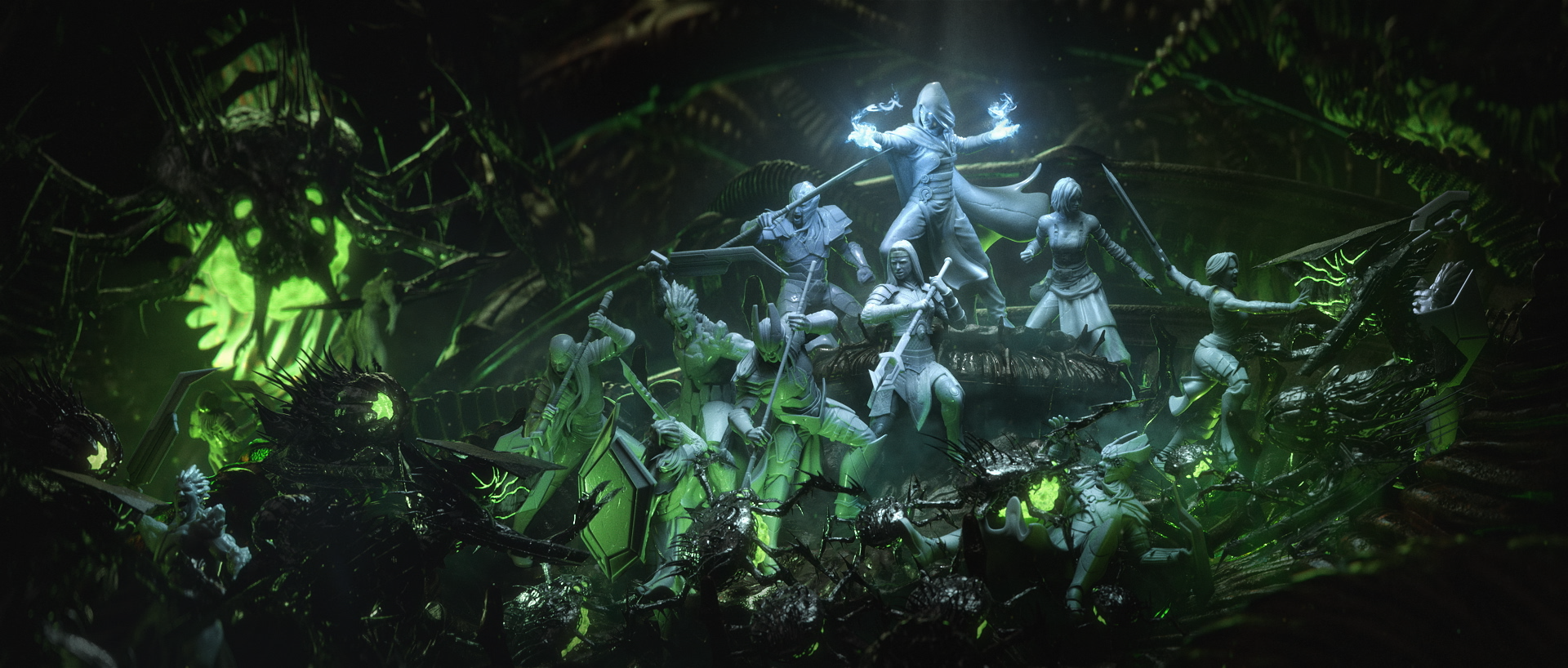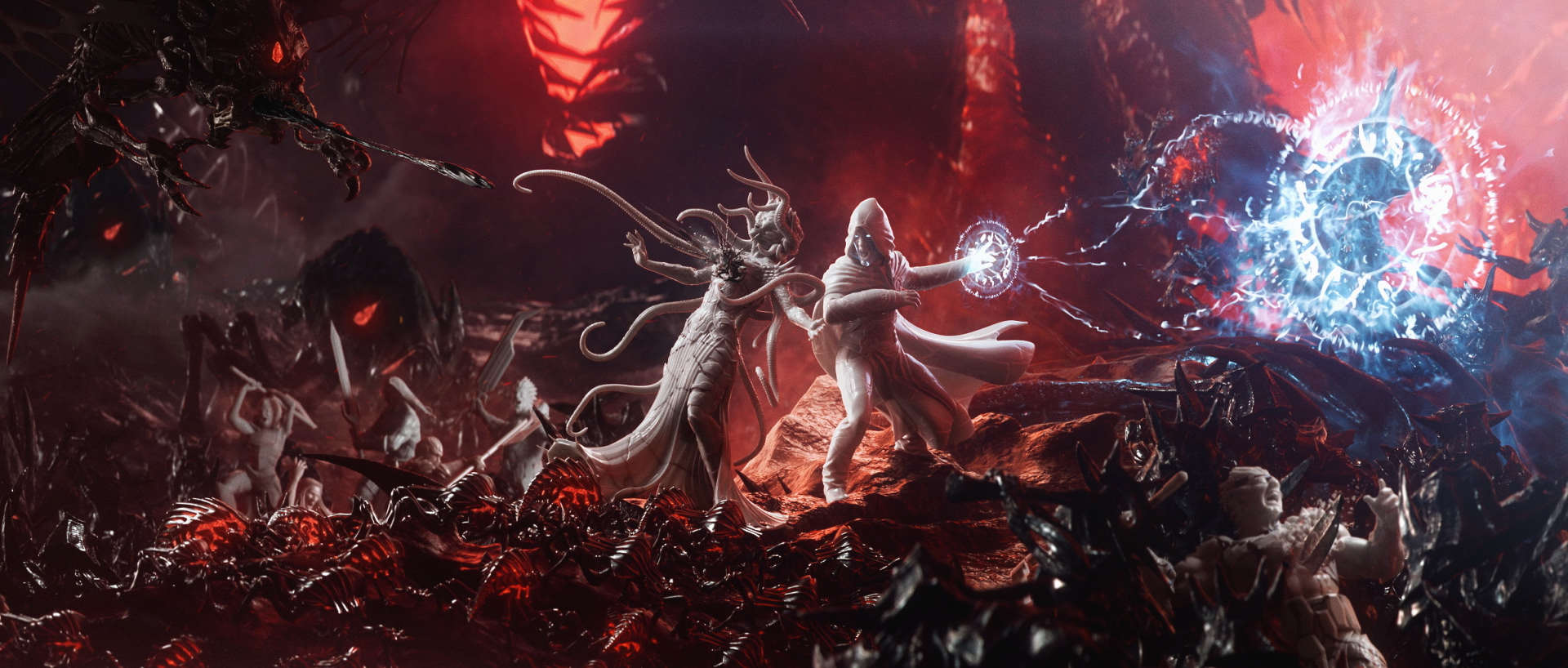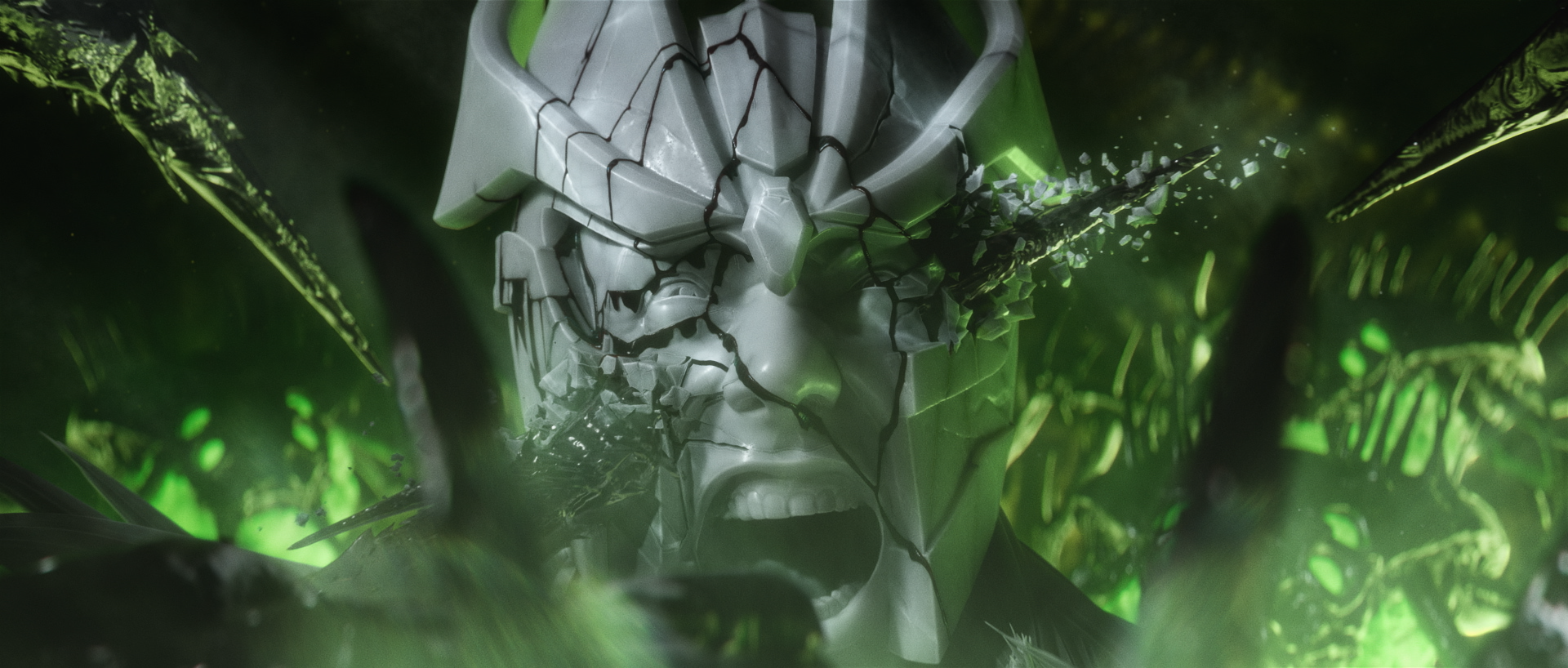 The trailer illustrates the resistance of the heroes (planewalker) to the phyrexian invasion through a large freeze frame battle composition where dazzling white porcelain statues face hordes of creatures covered in phyrexian oil, source of extraterrestrial life, gradually swallowing up any hope of victory. This graphic confrontation ends with the imposing throne of Helesh Norn composed of thousands of statues of soldiers who perished in front of it.